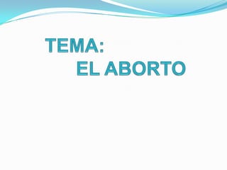 Este documento trata sobre el aborto. Explica que el aborto es la interrupción del embarazo antes de la época en que el feto es viable, generalmente antes de las 24 semanas. Luego clasifica los abortos en espontáneo, provocado o terapéutico, y describe cada tipo. También cubre los efectos físicos y psicológicos del aborto así como diferentes métodos para realizarlo.