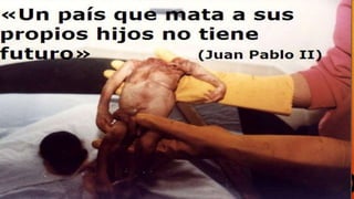 Este documento discute el tema del aborto desde perspectivas morales, educativas e intereses de poder. Describe los argumentos de grupos pro-vida y pro-aborto, los tipos de aborto (espontáneo e inducido), métodos para realizar abortos, causas y consecuencias físicas y psicológicas. Concluye que ante un embarazo no planeado, lo mejor es actuar de forma responsable para no poner en riesgo la vida sana.