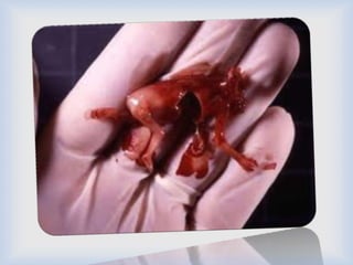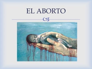 El documento define el aborto como la interrupción dolorosa del embarazo que causa la muerte del feto. Explica que hay dos tipos de aborto, espontáneo e inducido. El aborto espontáneo ocurre de forma no intencional antes de las 26 semanas y puede deberse a enfermedades de la madre, mientras que el aborto inducido es la interrupción activa del embarazo mediante medicamentos o cirugía. El documento también lista algunas posibles causas y síntomas de ambos tipos de aborto.