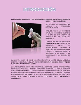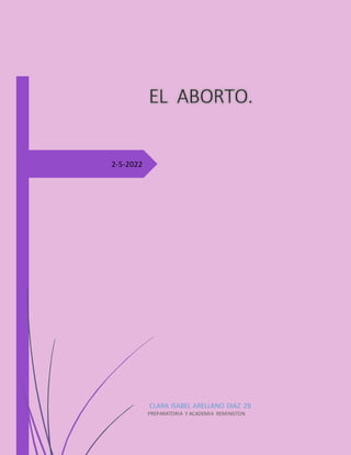 El documento trata sobre el aborto. Discute que el aborto puede interrumpirse de forma voluntaria o natural, y que cerca del 45% de los abortos se realizan en condiciones peligrosas. También habla sobre la historia del aborto en diferentes culturas y épocas, así como la postura de la Iglesia Católica respecto al aborto a través del tiempo. Finalmente, describe las características de un aborto espontáneo, provocado y terapéutico, así como las ventajas y desventajas del aborto.