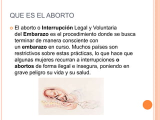 El documento trata sobre el aborto. Explica que el aborto es la interrupción de un embarazo, y describe los diferentes tipos de aborto, incluyendo espontáneo, inducido legal e ilegal. También discute las posibles causas y consecuencias físicas y psicológicas del aborto.