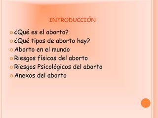 El documento resume los diferentes tipos de aborto, incluyendo aborto químico, quirúrgico, terapéutico y electivo. También describe los posibles riesgos físicos como infección, hemorragia y daños al útero, así como los riesgos psicológicos que incluyen efectos en la salud mental. Además, proporciona estadísticas sobre la legalidad del aborto en diferentes países del mundo.