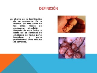 El documento define el aborto como la terminación de un embarazo antes de los 5 meses, y describe varios tipos de aborto, incluyendo espontáneo, terapéutico, por envenenamiento salino, succión, dilatación y curetaje, y prostaglandinas. También detalla los principales métodos quirúrgicos de aborto y sus riesgos, así como las posibles causas y consecuencias del aborto.