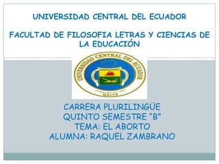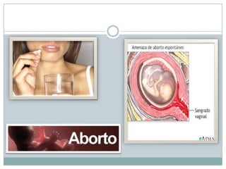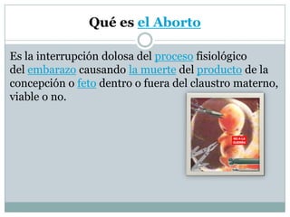 Este documento trata sobre el tema del aborto. Explica que el aborto es la interrupción del embarazo que causa la muerte del feto. Describe los diferentes tipos de aborto, incluyendo el inducido, espontáneo y terapéutico. También discute las causas comunes del aborto como el miedo y la violación, y las posiciones de diferentes religiones sobre el aborto. Finalmente, resume las posibles consecuencias y soluciones al problema del aborto.