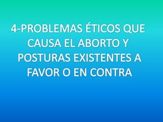 Este documento resume la historia del aborto y su situación actual en diferentes países. Explica que el aborto ha estado prohibido o permitido en diferentes momentos y culturas, influenciado por factores médicos, sociales, éticos y religiosos. También describe los diferentes métodos de aborto, legales e ilegales, y cómo la legalización del aborto se ha ido extendiendo en algunos países desde el siglo XX, aunque sigue siendo un tema muy debatido.