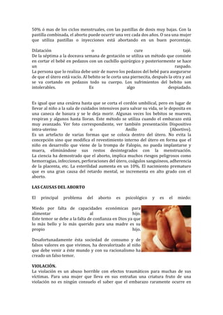 Este documento define el aborto y describe sus diferentes tipos y métodos, incluyendo el aborto espontáneo, provocado y terapéutico. También discute las causas psicológicas y sociales del aborto, como el miedo a la falta de recursos económicos y a la responsabilidad de un embarazo. Finalmente, reconoce que aunque el aborto sea legal, quitar una vida humana va en contra de las leyes divinas.