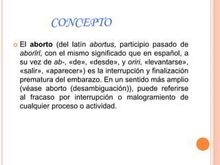 El aborto se refiere a la interrupción prematura del embarazo. Puede ocurrir de forma espontánea o inducida. El aborto espontáneo ocurre naturalmente en el 8-15% de los embarazos, mientras que el aborto inducido es el resultado de acciones deliberadas para terminar el embarazo. Existen cuatro tipos de aborto: espontáneo, introducido, legal e ilegal.