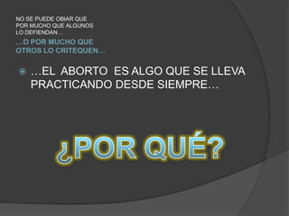 El documento debate sobre el aborto, planteando si es un crimen o un derecho fundamental. Señala que la actual legislación es inadecuada debido a la falta de consciencia y adecuada información sobre las consecuencias del aborto. Propone una regulación del aborto, destacando el derecho de la madre a decidir sobre la vida de su hijo, lo que deja abierta la discusión sobre este tema controvertido.