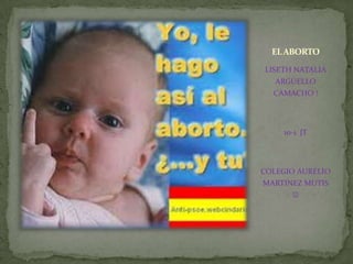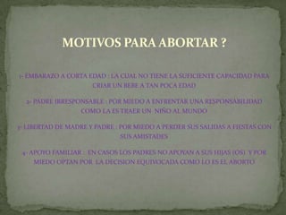 Este documento discute los motivos por los cuales algunas mujeres deciden abortar, incluyendo embarazos a corta edad, padres irresponsables y falta de apoyo familiar. También menciona métodos para abortar e impedir embarazos. Finalmente, explica que el aborto por inducción de contracciones involucra administrar sustancias que provocan contracciones uterinas similares al parto para expulsar al feto y la placenta.