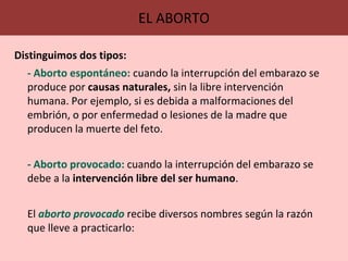 El documento aborda el aborto, definiéndolo como la interrupción voluntaria de la gestación, y distingue entre aborto espontáneo y provocado, este último con varias subcategorías. Se describen diferentes métodos de aborto y sus consecuencias, tanto físicas como psicológicas, así como la postura de la Iglesia Católica en contra del aborto, que aboga por la protección de la vida desde la concepción. Además, se discuten los efectos secundarios de medicamentos como la RU-486 y se mencionan las secuelas que pueden experimentar las mujeres tras un aborto.