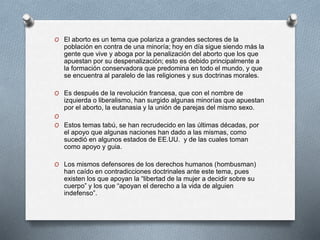 El documento discute el tema polémico del aborto. Explica que la mayoría de la población se opone al aborto debido a la influencia de las religiones conservadoras. Sin embargo, minorías liberales han surgido desde la Revolución Francesa a favor del aborto, la eutanasia y el matrimonio entre personas del mismo sexo. El documento también analiza los argumentos principales a favor y en contra del aborto, incluyendo el derecho de la mujer sobre su cuerpo versus el derecho a la vida del feto.
