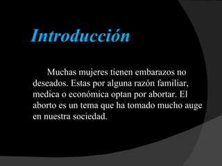El documento describe los diferentes tipos de abortos, incluyendo abortos por operación cesárea, envenenamiento salino, succión, dilatación y curetaje, y parto parcial. También discute los efectos físicos y psicológicos del aborto, así como los métodos de investigación y la conclusión de que el aborto es un crimen y no una solución a los embarazos no deseados.