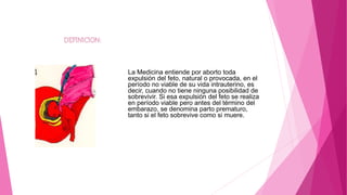 El documento define el aborto como la expulsión natural o provocada del feto durante el período no viable de su vida intrauterina, cuando no tiene posibilidad de sobrevivir. Señala que las principales causas del aborto son los problemas económicos de la madre y las violaciones, y que las consecuencias para la madre incluyen la muerte y problemas psicológicos. Finalmente, incluye citas que condenan el aborto como un crimen por quitar la vida a un ser inocente.
