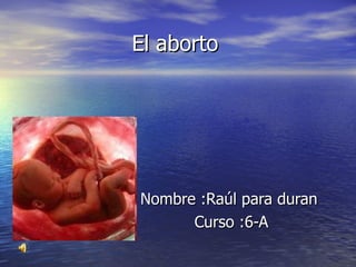 El documento describe los diferentes métodos de aborto, incluyendo la succión, dilatación y curetaje, dispositivos intrauterinos y cesárea. Explica que el aborto causa la muerte del feto y trae consecuencias físicas y psicológicas graves para la mujer, como hemorragias, infecciones, esterilidad e incluso traumas que la persiguen de por vida. Finalmente, hace un llamado a elegir la vida y no el aborto.