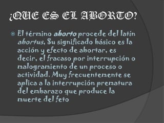 El aborto puede ser inducido o espontáneo. El aborto inducido se realiza intencionalmente antes de las 20 semanas de gestación, mientras que el aborto espontáneo ocurre de forma no intencional antes de la semana 20. Existen diferentes métodos para realizar un aborto inducido como el químico, que usa una combinación de fármacos, o procedimientos quirúrgicos que conllevan riesgos físicos como infecciones o hemorragias. La legislación distingue entre aborto terapéutico por razones médicas y aborto