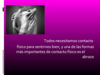 El documento describe los beneficios del contacto físico y los abrazos para la salud mental y emocional. Específicamente, señala que los abrazos ayudan a reducir el estrés, la ansiedad y la depresión al provocar cambios fisiológicos positivos. También afirma que los abrazos frecuentes son necesarios para sobrevivir, mantenerse y desarrollarse como persona. Finalmente, enfatiza que los abrazos brindan protección, seguridad, confianza, fortaleza y mejoran la salud y auto