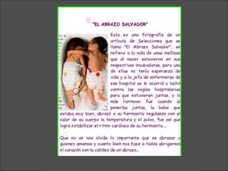 El documento describe los beneficios físicos y emocionales de los abrazos, señalando que el contacto físico a través de abrazos ayuda a las personas a sentirse seguras, fortalecidas y protegidas. Los abrazos alivian el estrés, la ansiedad y la depresión, y mejoran la salud transmitiendo una energía vital. Se recomienda abrazar a otros al menos doce veces al día para crecer emocionalmente.