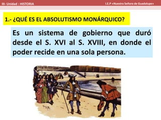 El absolutismo monárquico fue un sistema de gobierno entre los siglos XVI y XVIII donde el poder residía en una sola persona, el rey. Se basaba en el poder ilimitado del rey como voluntad divina. Tuvo mayor trascendencia en Francia, Inglaterra y España durante la Edad Moderna.