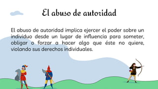 El documento habla sobre el abuso de autoridad. Define el abuso de autoridad como ejercer el poder sobre otros para someterlos u obligarlos a hacer algo en contra de su voluntad y violando sus derechos. Da algunos ejemplos como un presidente que se vuelve tirano u oficiales de policía que extorsionan a la gente. Explica que el abuso de autoridad viola derechos como la libertad, igualdad y debido proceso. Recomienda que los ciudadanos denuncien tales abusos ante las autoridades correspondientes.