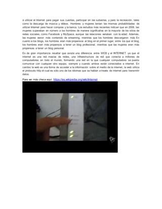 El documento describe diferentes métodos de acceso a internet en hogares y lugares públicos, incluyendo dial-up, banda ancha y Wi-Fi. Se discuten interrupciones de servicio, diferencias en el uso de internet entre hombres y mujeres, y se destaca la distinción entre internet y la web. Además, menciona el crecimiento de redes comunitarias y el acceso desde dispositivos móviles.