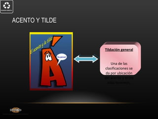 Este documento habla sobre las reglas de acentuación en español. Explica que existen diferentes tipos de palabras según la sílaba tónica como agudas, graves, esdrújulas y sobresdrújulas. Luego detalla las reglas generales de acentuación para cada tipo de palabra, así como casos especiales como diptongos, triptongos e hiatos. Por último, cubre otros temas como la acentuación de monosílabos y el uso de tildes diacríticas.