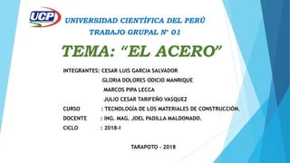 Este documento presenta información sobre el acero, incluyendo su historia, proceso de fabricación, clasificaciones, propiedades y usos. Resume el estado del arte del acero a nivel mundial, nacional, regional y local. Explica los elementos de aleación comunes en el acero y cómo estos afectan sus propiedades.