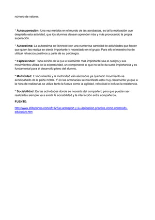El acrosport es un deporte acrobático y coreográfico que integra formaciones corporales, acrobacias y elementos de danza. Se caracteriza por requerir cooperación entre los participantes para lograr las figuras y movimientos. Tiene aplicaciones valiosas en educación física pues promueve habilidades motoras, creatividad, autoestima y sociabilidad.