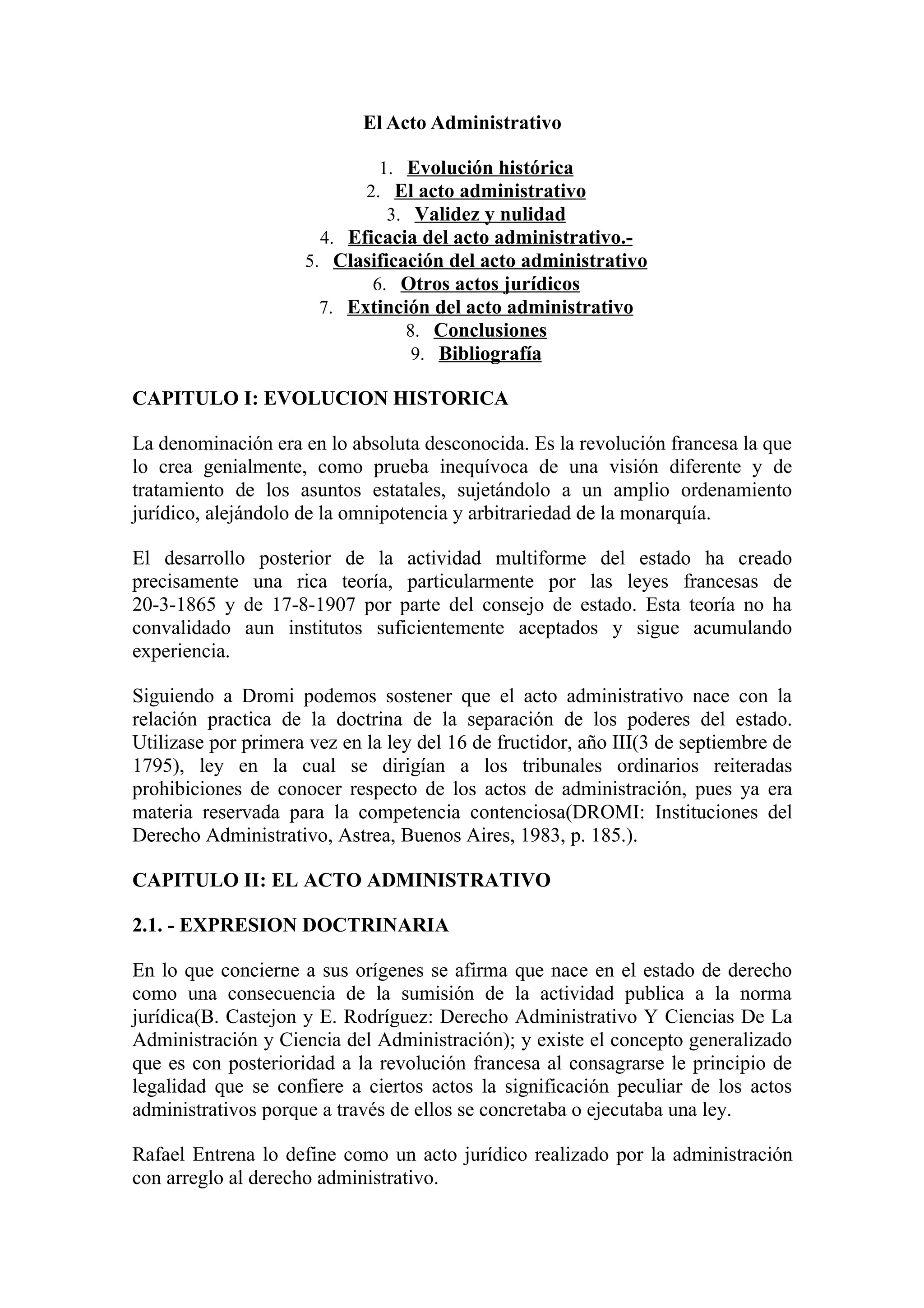 Este documento resume el concepto y elementos del acto administrativo desde una perspectiva histórica. Explica que el acto administrativo surgió con la Revolución Francesa para someter la actividad pública al derecho. Describe los elementos del acto según varios autores como la competencia, declaración de voluntad, y efectos jurídicos. También analiza los requisitos de validez como la competencia y forma, así como las causales de nulidad como la contravención a leyes o defectos en los requisitos.