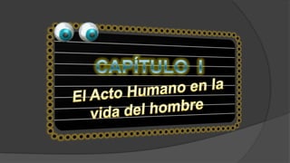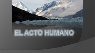 Este documento describe los elementos que componen un acto humano voluntario. Explica que un acto voluntario implica la acción interna y externa de una persona que actúa según su voluntad, guiada por el entendimiento y después de una deliberación previa. Además, detalla los tipos de conocimiento y voluntad involucrados, así como los conceptos de advertencia y consentimiento.