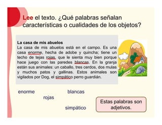 La casa de los abuelos se encuentra en el campo. Es una casa grande hecha de adobe y quincha, con un techo rojo que combina con las paredes blancas. En la granja hay varios animales como un caballo, cerdos, mulas y aves, los cuales son cuidados por un perro llamado Dog.