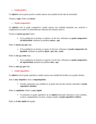 El documento describe los adjetivos, incluyendo que son palabras que modifican sustantivos indicando cualidades, que concuerdan en género y número con el sustantivo, y que pueden estar en grado positivo, comparativo o superlativo. También distingue entre adjetivos explicativos y especificativos.