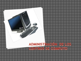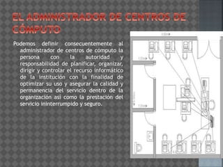 El documento describe las funciones y responsabilidades de un administrador de centros de cómputo, incluyendo planificar, organizar, dirigir y controlar los recursos informáticos de una institución para optimizar su uso y asegurar la calidad y continuidad del servicio de manera segura. También define los diferentes niveles de planeación requeridos como la estratégica, de recursos, operativa, de personal e instalaciones físicas.