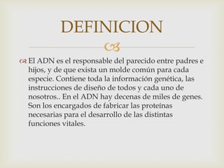 El documento describe la estructura química del ADN. Explica que el ADN está compuesto de dos cadenas retorcidas formando una doble hélice. Cada cadena contiene nucleótidos compuestos de azúcar, fosfato y bases nitrogenadas (adenina, guanina, timina o citosina).