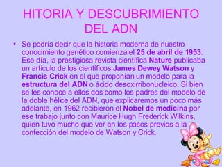 El documento describe el descubrimiento y la estructura del ADN. Explica que en 1953, Watson y Crick publicaron su modelo de la doble hélice del ADN y que en 1962 recibieron el Premio Nobel de Medicina por este trabajo junto con Wilkins. Describe que el ADN está formado por cuatro nucleótidos que se emparejan siempre de la misma forma y que codifican las instrucciones para fabricar seres vivos.