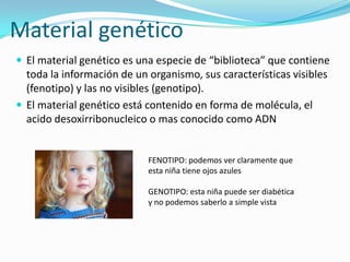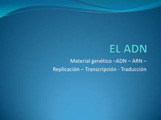 El documento resume los procesos fundamentales del ADN: la replicación, que duplica el material genético para la división celular; la transcripción, que convierte el ADN en ARNm para salir del núcleo; y la traducción, donde el ARNm se lee para formar proteínas a través de los codones. Estos procesos son cruciales para expresar y heredar la información genética.