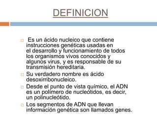 El ADN, o ácido desoxirribonucleico, es un ácido nucleico que lleva las instrucciones genéticas para el desarrollo y funcionamiento de los organismos vivos. Está compuesto por nucleótidos que incluyen bases nitrogenadas como adenina, citosina, guanina y timina, y tiene estructuras primaria, secundaria y terciaria que organizan la información genética. Sus funciones clave incluyen la transcripción, traducción y duplicación de información genética.