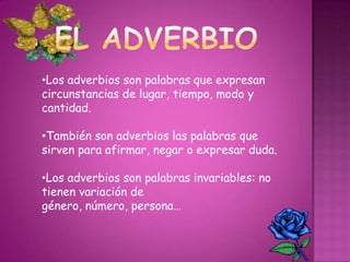 Este documento describe las clases y funciones de los adverbios. Explica que los adverbios se clasifican según la circunstancia que expresan, como lugar, tiempo, modo y cantidad. Además, indica que los adverbios con frecuencia funcionan como complementos de un verbo, adjetivo u otro adverbio para ofrecer más información sobre ellos.