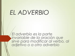 El documento ofrece una síntesis sobre los tipos de adverbios y su función en las descripciones, con ejemplos para facilitar la comprensión del tema. Se explican tres funciones del adverbio: modificar un verbo, un adjetivo o a otro adverbio, y se presentan diferentes clases de adverbios y frases adverbiales. Además, incluye ejercicios de identificación y clasificación de adverbios en oraciones.
