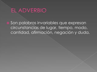 Este documento define los adverbios como palabras invariables que expresan circunstancias de lugar, tiempo, modo, cantidad, afirmación, negación y duda. Proporciona ejemplos de adverbios de cada categoría y explica que los adverbios de lugar, tiempo, modo y cantidad a menudo se añaden a los verbos para ofrecer más información sobre la acción.