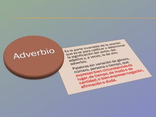 El documento clasifica los adverbios en dos puntos de vista: semántico y formal. Desde el punto de vista formal, los adverbios se dividen en terminados en "-mente" y locuciones adverbiales. Los adverbios terminados en "-mente" se forman a partir de un adjetivo, mientras que las locuciones adverbiales son conjuntos de dos o más palabras que funcionan como adverbios.
