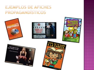 Este documento describe los elementos clave de un afiche, incluyendo un slogan breve, una imagen motivadora y información relevante. Explica que los afiches son textos no literarios e informativos que buscan difundir un mensaje de manera atractiva y convincente para captar rápidamente la atención del lector. También provee instrucciones para la creación de un afiche efectivo.