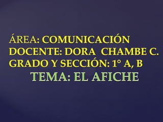 Un afiche es un anuncio gráfico que combina imágenes y texto para persuadir al público a realizar una acción. Tiene como propósito convencer al público de una idea o acción a través de un título, imágenes y slogan. Existen dos tipos principales de afiches: los publicitarios, que intentan convencer a la gente para comprar un producto o servicio, y los propagandísticos, que pretenden modificar o mantener conductas en el público.