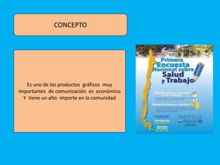 El afiche es un producto gráfico esencial para la comunicación que tiene gran relevancia en la comunidad. Su elaboración requiere una idea central expresada de forma simple y concreta, incluyendo detalles relevantes como fechas y lugares. Se sugiere utilizar un diseño llamativo, con un título visible y colocarlo en lugares de alta circulación donde no compita con otros carteles.