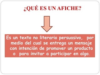 El documento define un afiche como un texto no literario persuasivo que entrega un mensaje para promover un producto o invitar a participar en algo. Explica que un afiche tiene una estructura básica que incluye un título, imagen y slogan. Además, distingue entre afiches publicitarios, cuyo objetivo es convencer a la gente para adquirir un producto, y afiches propagandísticos, que pretenden modificar o mantener conductas.
