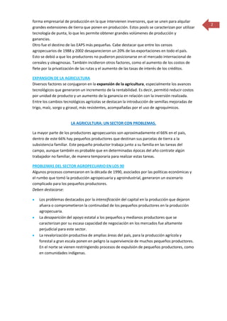 El documento describe los procesos y problemas del sector agropecuario argentino. Explica que las políticas neoliberales de los años 90 favorecieron a los grandes productores y perjudicaron a las pequeñas explotaciones agropecuarias, llevando al 20% de ellas a desaparecer. También describe los principales circuitos productivos agroindustriales como la producción lechera y de harina de trigo, y cómo se fueron concentrando en pocas empresas.