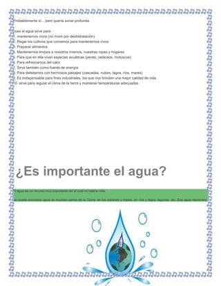 El documento habla sobre el agua. Explica que el agua es esencial para la vida y está compuesta de moléculas de H2O. Describe que el agua se encuentra en los océanos, glaciares, depósitos subterráneos y en formas de vapor, hielo y liquido. También discute el ciclo del agua y sus usos en la agricultura, industria y hogares.