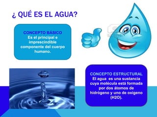 El documento describe las propiedades y funciones del agua en el cuerpo humano y en la naturaleza. El agua constituye alrededor del 60% del cuerpo humano y juega un papel vital al transportar nutrientes y oxígeno a las células, regular la temperatura, y ayudar a convertir los alimentos en energía. En la naturaleza, el agua es esencial para todos los seres vivos y desempeña un papel importante en procesos como la erosión, la navegación y la generación de energía. El documento
