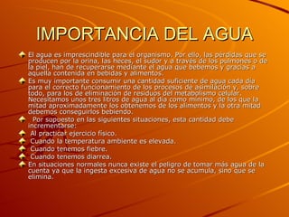 El agua es esencial para los seres humanos y otros organismos. Necesitamos alrededor de 3 litros de agua al día para funcionar correctamente, aunque esta cantidad puede aumentar con el ejercicio o el calor. La contaminación del agua proviene de desechos humanos, químicos agrícolas y derrames de combustible. Aunque la Tierra está cubierta mayormente por agua, sólo el 2% es agua dulce y la mayoría está en los polos o muy profunda, dejando sólo el 0.014% disponible.