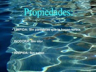 El agua es el compuesto químico más abundante en la Tierra y esencial para la vida. Representa el 97.2% de los océanos, 2.15% en glaciares y casquetes polares, y el resto en ríos, lagos y aguas subterráneas. El agua es vital para las funciones corporales y reacciones químicas de los seres vivos, y también se usa para generar energía hidroeléctrica. La contaminación, el uso indiscriminado y el cambio climático amenazan la disponibilidad de