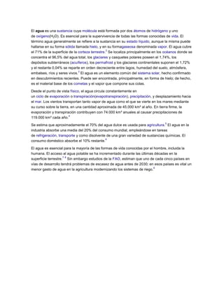 El agua es una sustancia esencial para la vida compuesta por oxígeno e hidrógeno. Representa el 71% de la superficie terrestre y se encuentra principalmente en los océanos, glaciares y acuíferos subterráneos. Circula constantemente a través del ciclo de evaporación, precipitación y transporte hacia los mares. Aproximadamente el 70% del agua dulce se utiliza para la agricultura, el 20% para la industria y el 10% restante para el consumo doméstico.